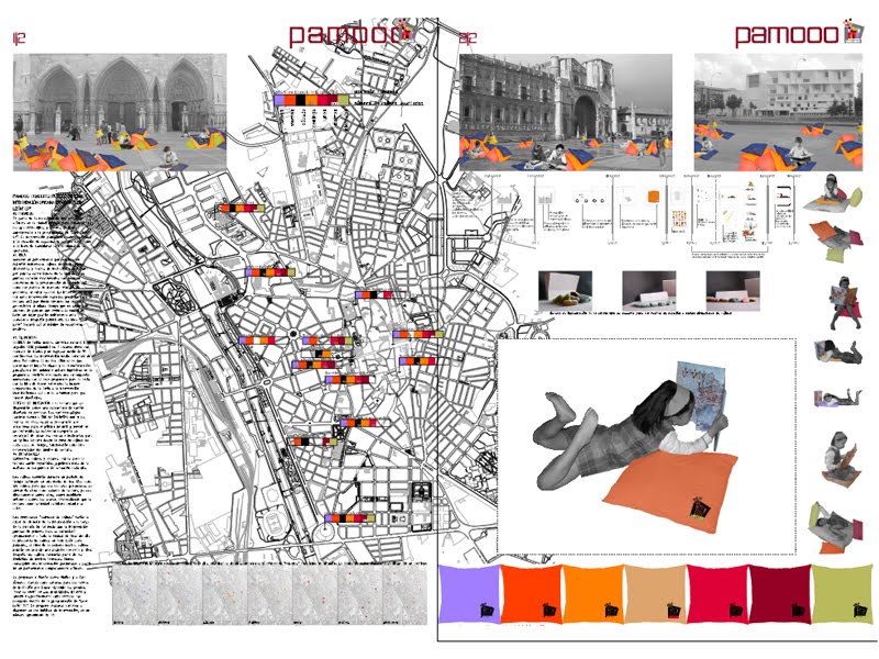 Generar un performance que consista en repartir numerosos cojines de siete colores diferentes y textos de incitación a la lectura por puntos estratégicos de la ciudad. Estos puntos estarán relacionados con eventos concretos de la programación de la feria así como con puntos de marcado tránsito de peatones en edad escolar. La intención es crear con esta intervención espacios propicios para la lectura allá por donde circulen los lectores potenciales al mismo tiempo que se genera un sistema de paisaje que revisa la ciudad de León sin dejar peatón indiferente ante semejante irrupción publicitaria. La idea «Leer León» llegará así al máximo de receptores posibles.