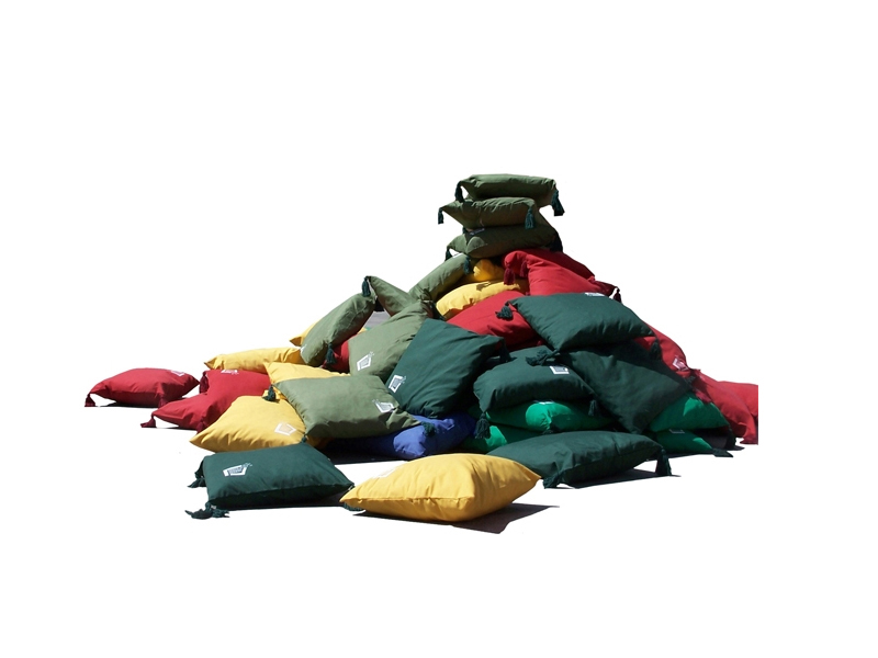 COJINES de tejido mezcla sintético natural [50% algodón 50% poliamida] en 7 colores vivos con formato 45x45cm y un espesor medio de 10. La intervención media constará de unos 150 cojines [3 metros cúbicos] lo que garantiza el impacto visual y la transformación paisajística del ambiente urbano implícitos en la propuesta. Tendrán efectuada una estampación monocroma con el logo propuesto para la feria con la idea de hacer extensiva la imagen corporativa de la feria a la intervención identificándola así con la actividad para que fueron diseñados.